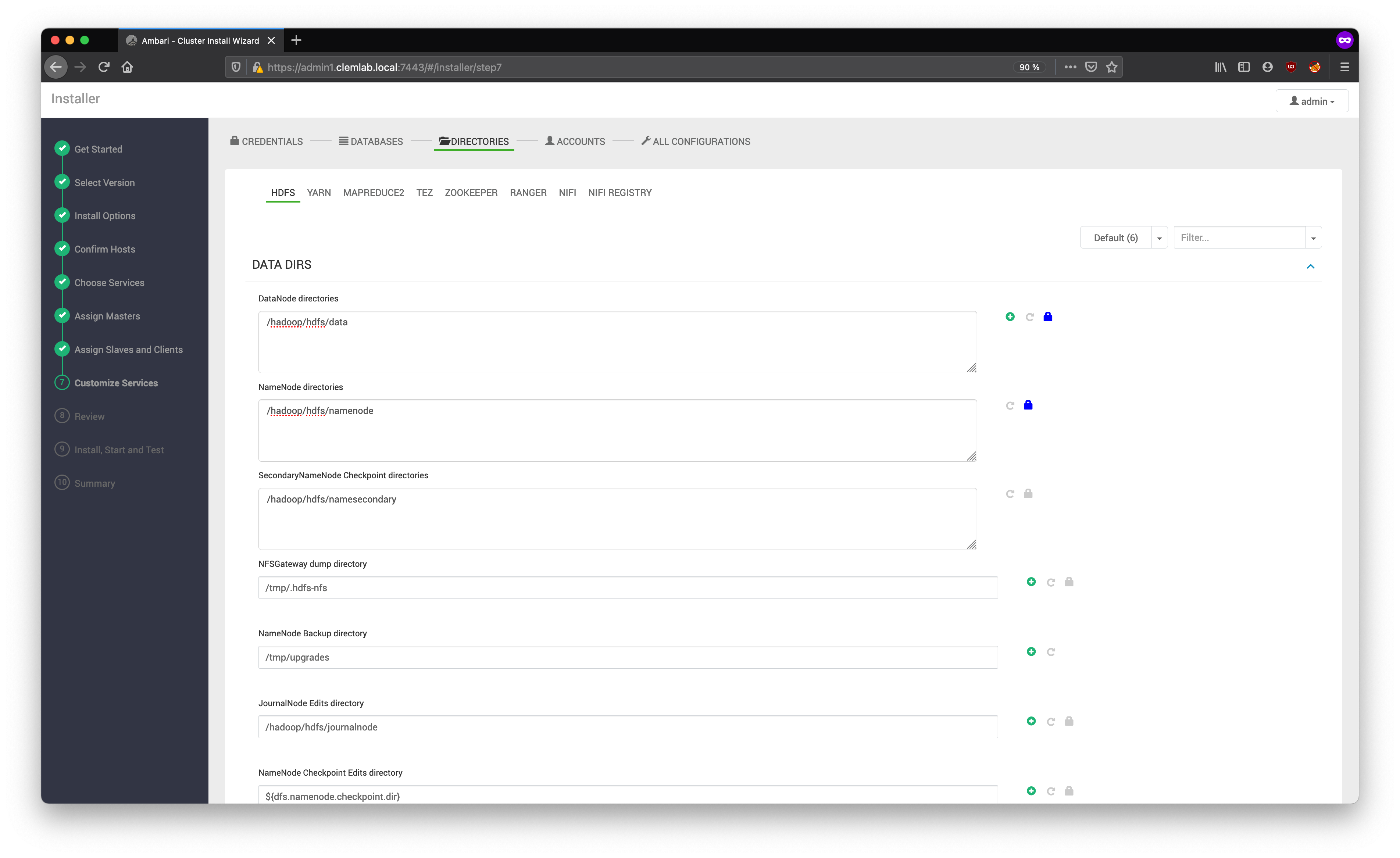 Choosing the right directories for storing data and logs is essential. Ambari chooses reasonable defaults based on the mount points available in your environment, but we strongly encourage you to review the default directory settings recommended by Ambari. In particular, confirm that directories such as /tmp and /var are not used for the HDFS NameNode and DataNode directories under the HDFS tab.