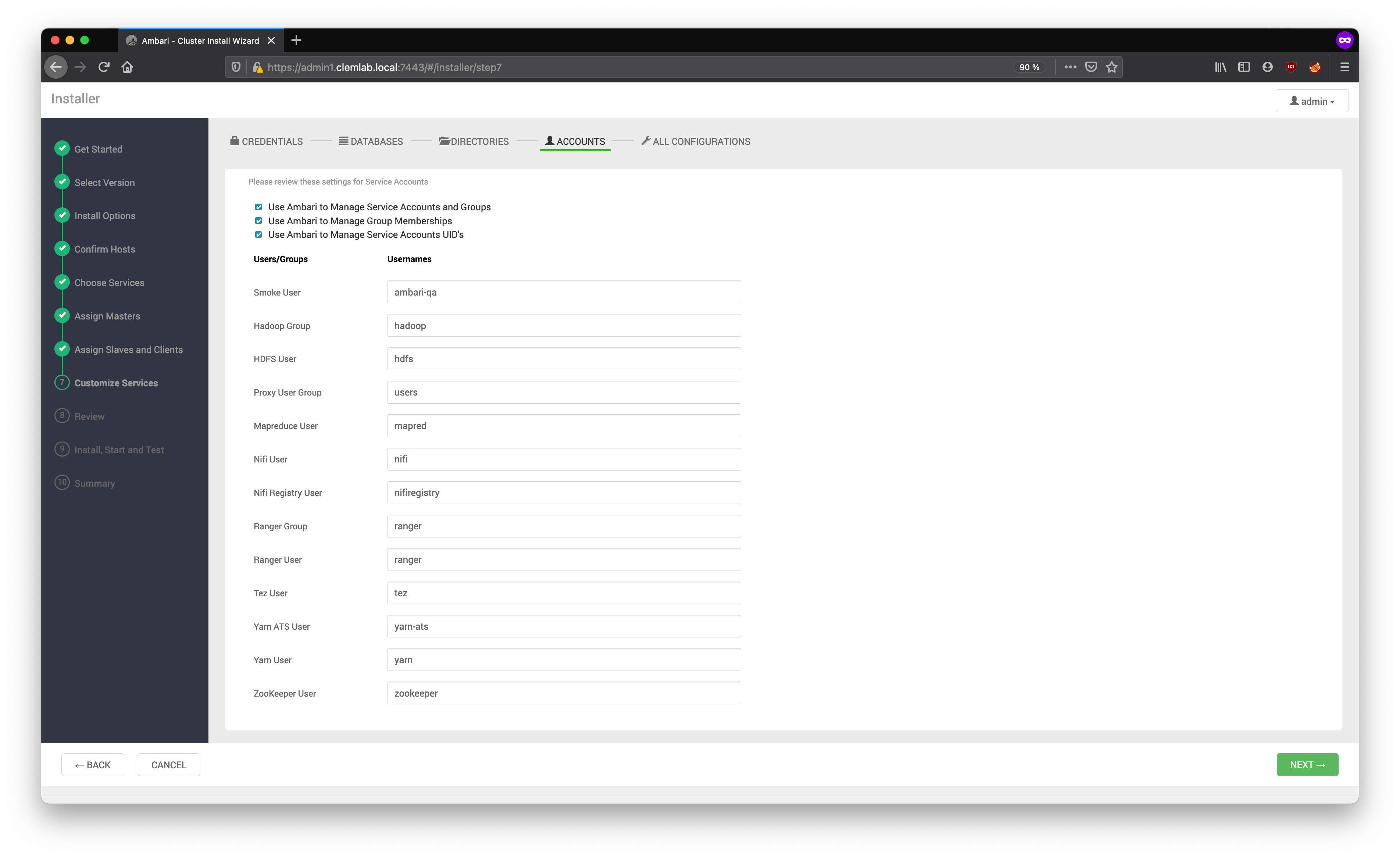 Service account users and groups are also configurable from the Accounts tab. These are the operating system accounts under which the service components will run. If these users do not exist on your hosts, Ambari will automatically create the users and groups locally on the hosts. If these users already exist, Ambari will use these accounts.