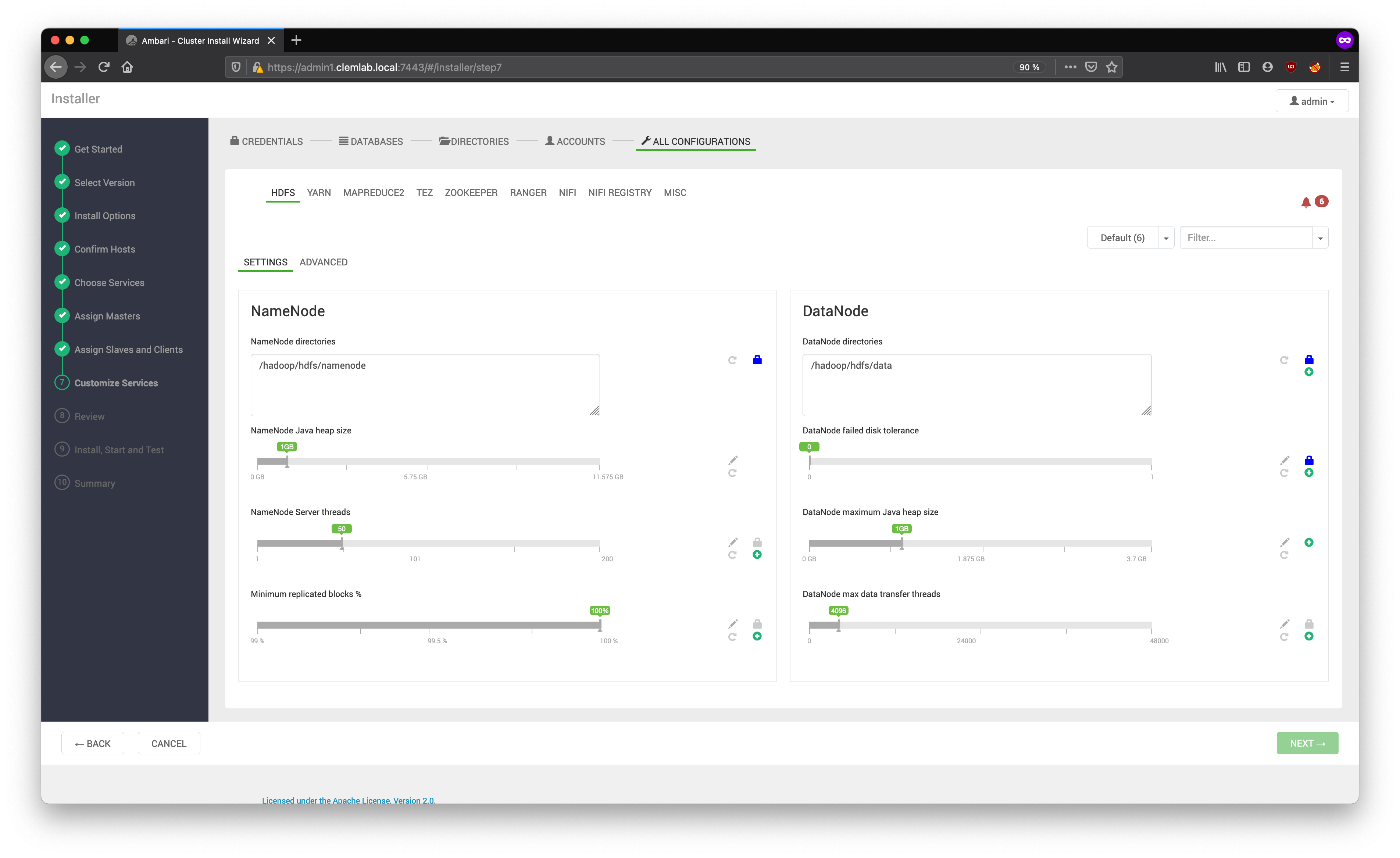 The Customize Services step presents you with a set of tabs that allow you to view and modify the configuration of your cluster.
