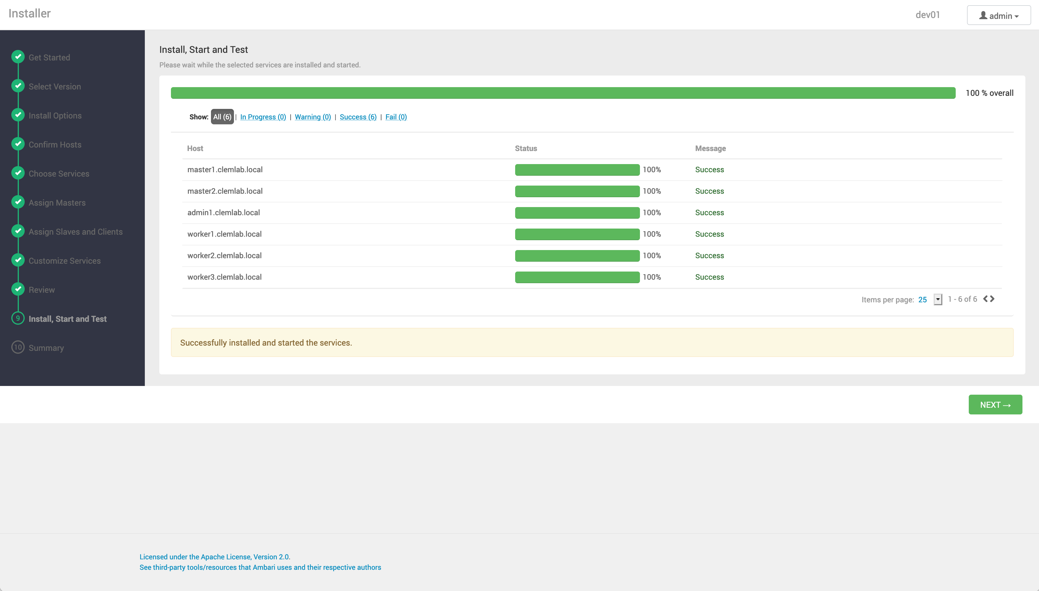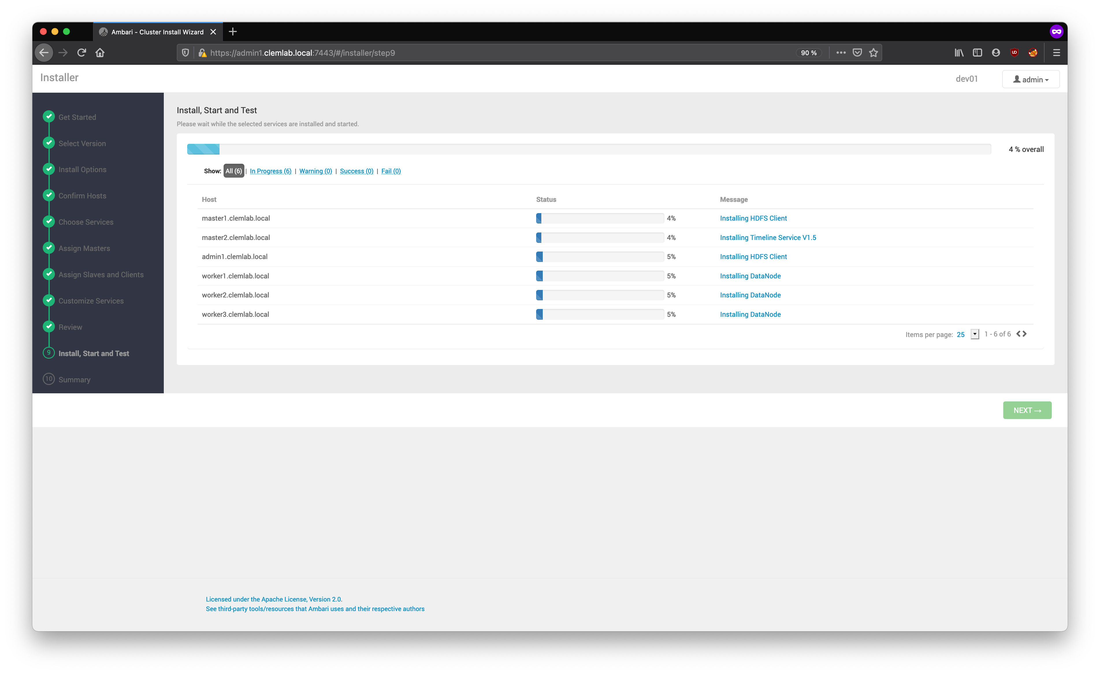 The installation progress is displayed on the screen. Ambari installs, starts and runs a simple test on each component. The overall process status is displayed in the progress bar at the top of the screen and the host-by-host status is displayed in the main section. Do not refresh your browser during this process. Refreshing the browser may interrupt progress indicators.