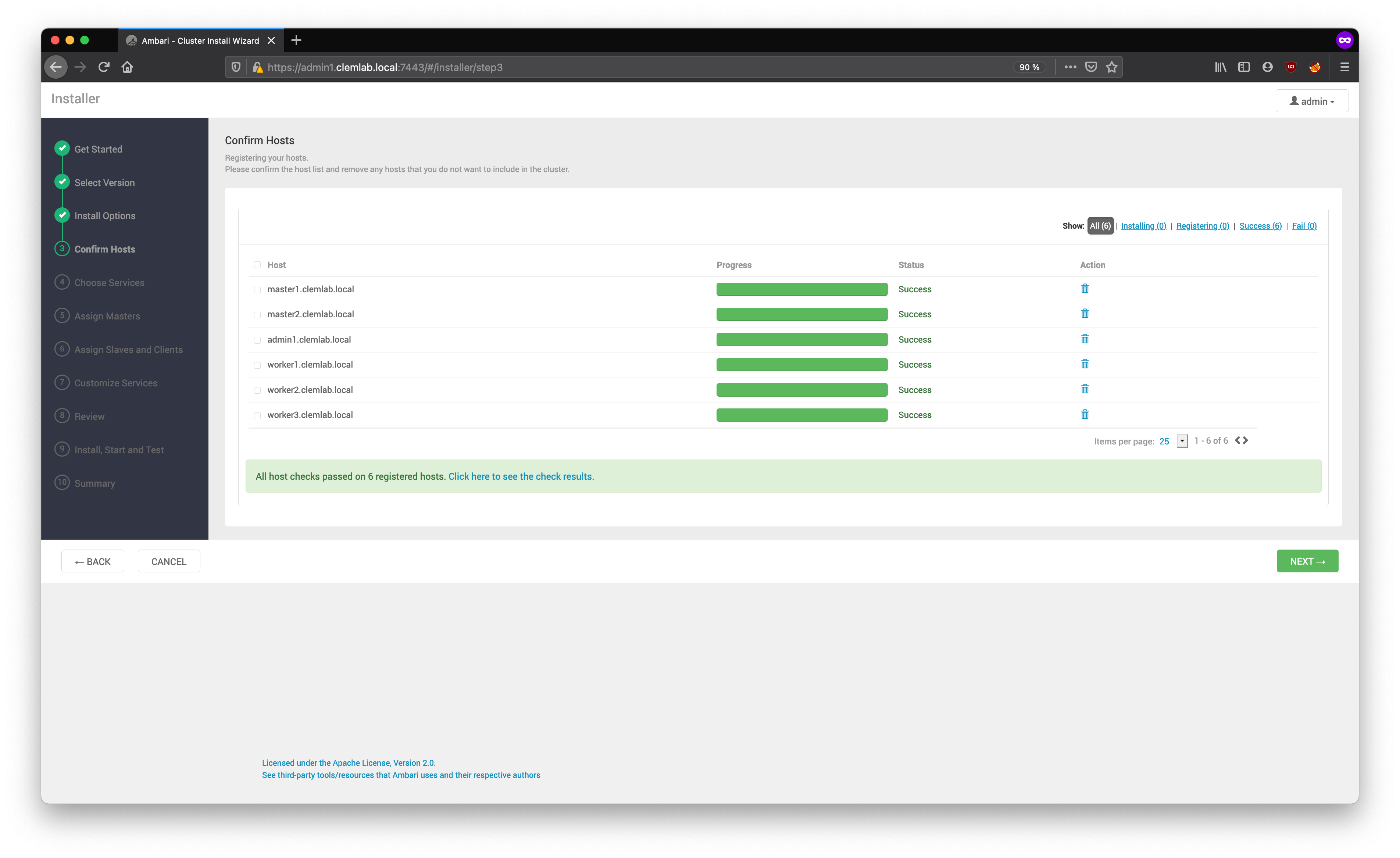 Confirm Hosts prompts you to confirm that Ambari has located the correct hosts for your cluster and to verify those hosts to ensure that they have the correct directories, packages, and processes required to continue the installation.
